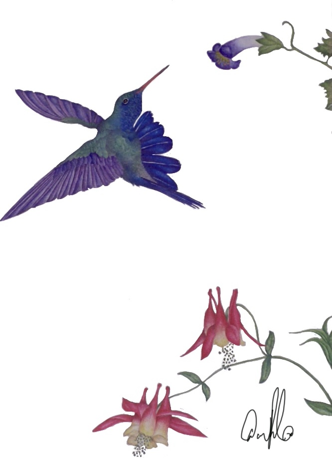 Broadbilled Hummingbird on Easter Red Columbine and Salvia